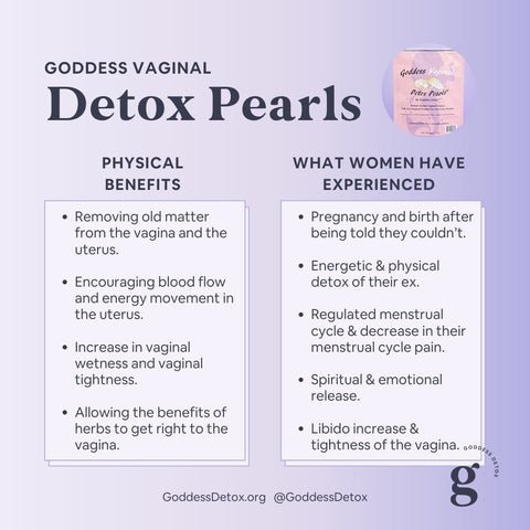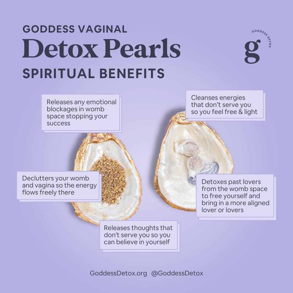 The Goddess Vaginal Detox Pearls are all-natural herbal vaginal suppositories that allow users to have a very deep physical and spiritual cleansing of their wombs and vaginas. They are inserted into the vagina, one at one time, and left in for 1-2 days. They are a vaginal detox product.