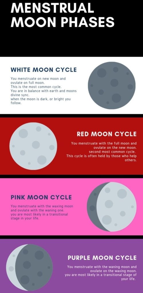 There are two traditional menstruation patterns – The first is the White Moon or menstruating with the new moon. The second is the Red Moon or menstruating with the full moon. But now we observe 4 overall.