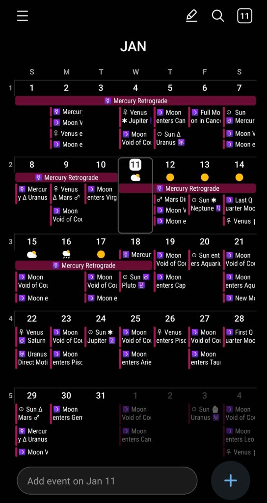 Always know what’s going on in the stars! 2 separate calendars available, all astrological aspects for the year, and then all the Moon phases of the year (they’re on 2 separate calendars as the Moon switches signs and places every 2.5 days so it can really overpower the calendar agenda) easy to switch on and off