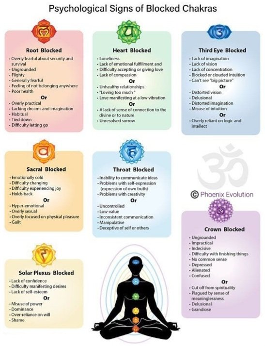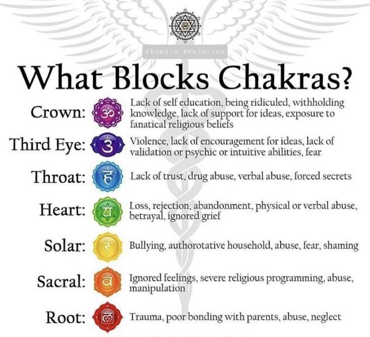 There’s many situations that can cause blockages in our energy field. Here are some blockages for each of the central 7 chakras (the most known)