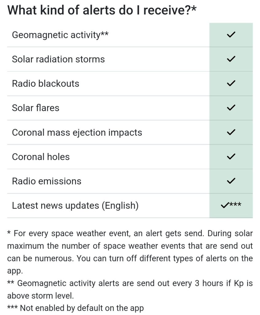 The most reliable and extensive space weather and aurora alert service available! They provide a wide variety of space weather alerts like aurora alerts, solar flare alerts etc.